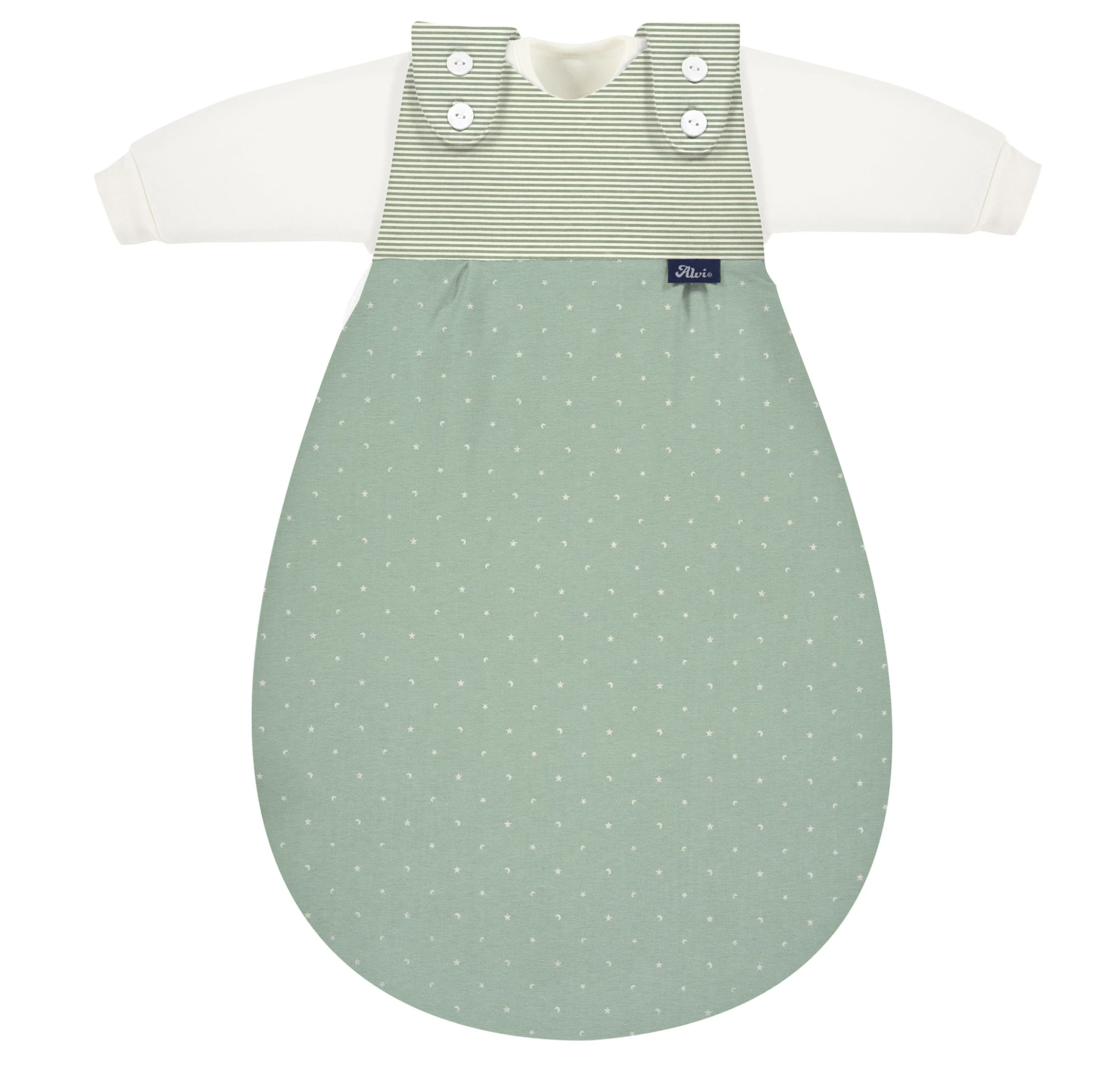 Baby-Mäxchen – Das Original. 3tlg. – aus Baumwolle – bestehend aus 1 (mitwachsenden) Außensack und 2 Innensäcken aus Bio-Baumwolle in aufeinanderfolgenden Größen. Er bietet bedingt durch die Birnenform ein Höchstmaß an Strampelfreiheit und ist über die Knopfleiste in der Größe variabel. Der Innensack aus Bio-Baumwolle ist mit langen Ärmeln und anschmiegsamen Strickbündchen, einzeln auch als leichter Sommersack zu verwenden. Durch den umlaufenden Reißverschluss ist kein Einklemmen der zarten Babyhaut am Hals möglich. Der Außensack ist aus kuschligem Baumwoll-Jersey und leicht wattiert. Das Rückenteil ist ohne störende Naht gefertigt. Zusätzlich sind am Außensack Kabelauslassöffnungen eingearbeitet. Der Schlafsack ist bis 60° waschbar und kann bei reduzierter thermischer Beanspruchung getrocknet werden.