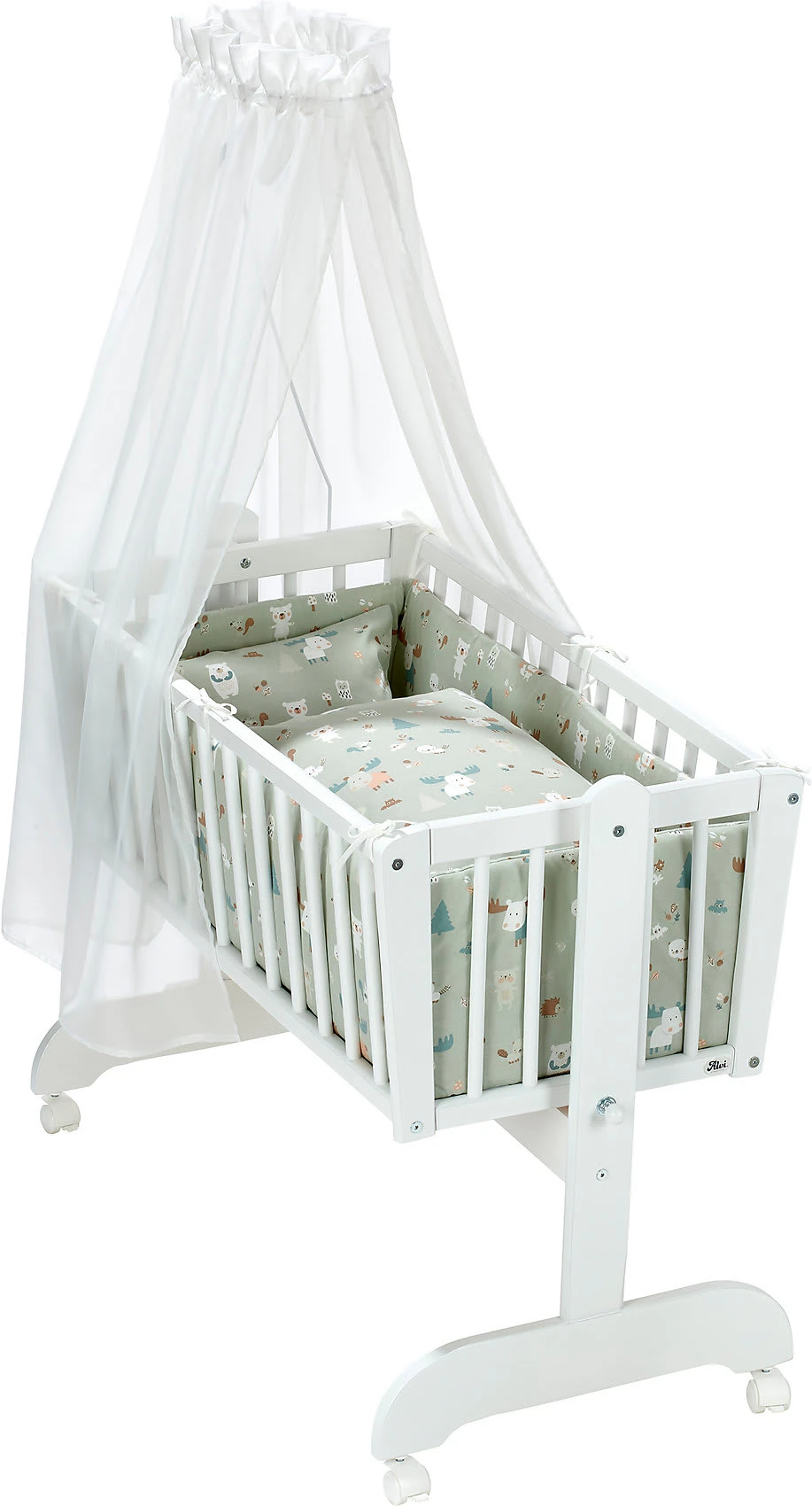 Die dreiteilige Wiegengarnitur von Alvi besteht aus Bettwäsche einem Nestchen und einem Himmel. Es sorgt für wohlige Gemütlichkeit und sieht zudem sehr hübsch aus.
