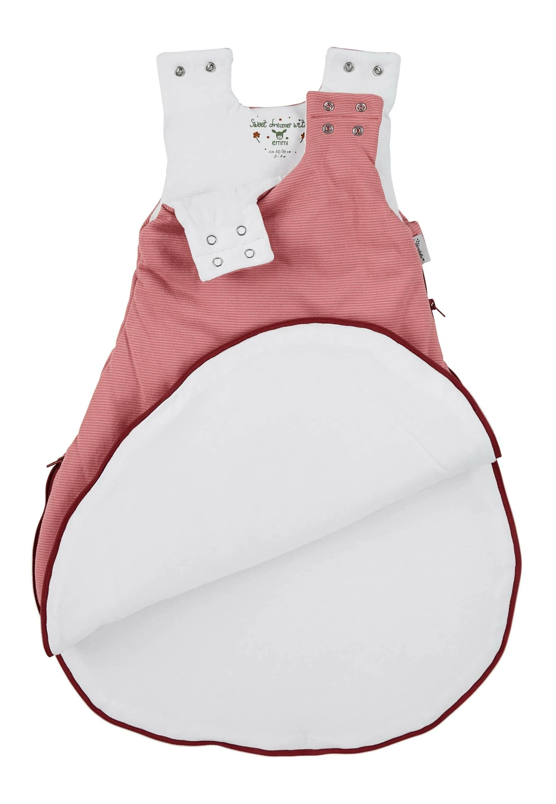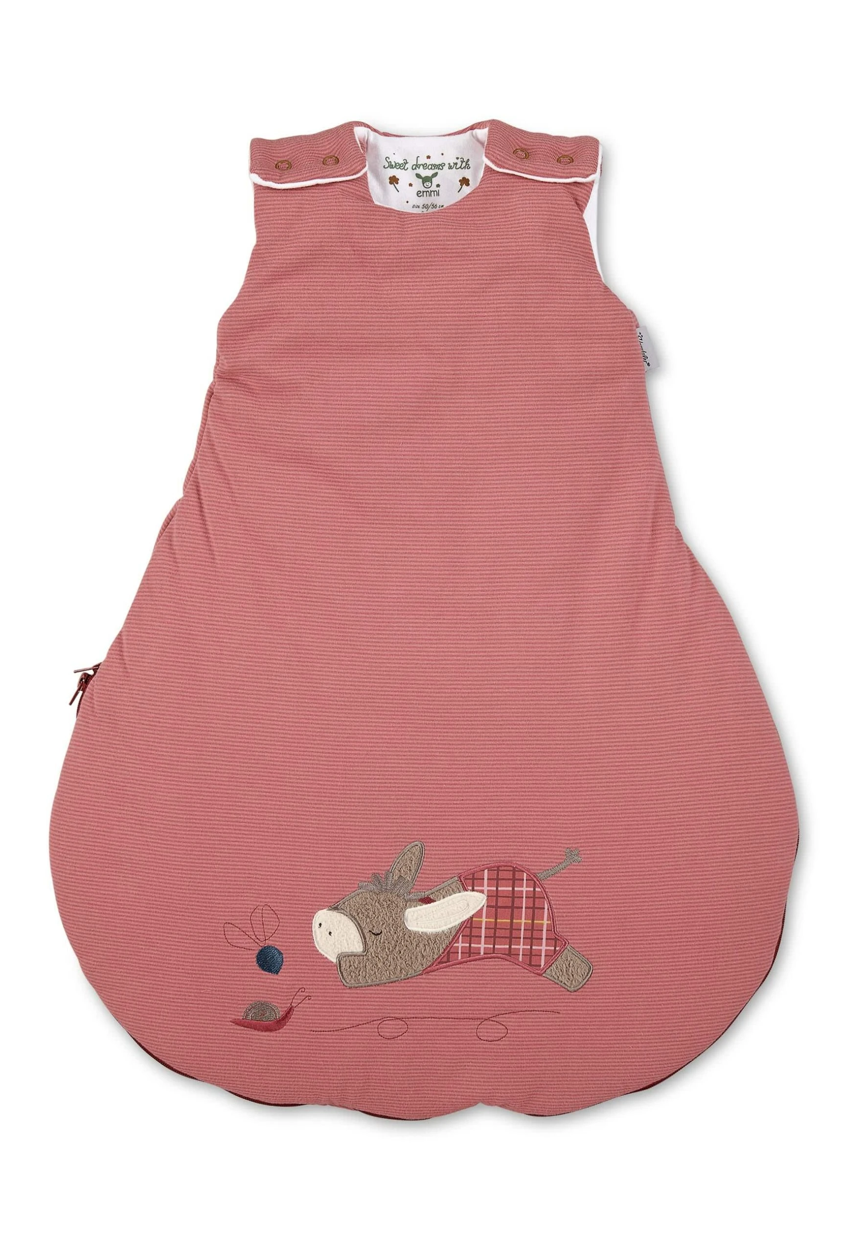 Baby-Schlafsack mit Motiv Esel Emmily aus Jersey. Dieser Schlafsack wurde extra für die Bedürfnisse der Kleinsten entwickelt. Durch das doppelte Knopf-System wächst der Schlafsack über 2 Größen mit. Der Schlafsack hat ein angenehmes Jerseyfutter und ist kuschelig warm, aber auch leicht durch die Wattierung. Da keine Nähte im Rückenbereich angelegt sind, gibt es keine Druckstellen. Bei Bedarf kann der Baby-Schlafsack mit dem passenden Innen-Schlafsack kombiniert werden. 3,50 TOG.