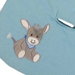 Wattiertes Strampelnest aus Jersey mit praktischem Gurtschlitz, mit Motiv Esel Emmi. Kuschelig verpackt kann die Reise losgehen!
